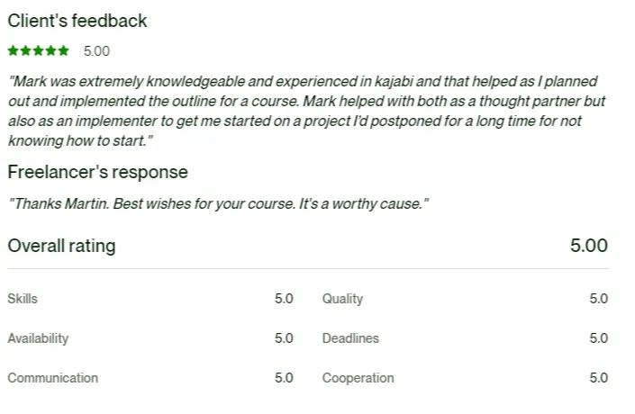 You get full implementation of your sales page, checkout page, course curriculum design, free offer set up, platform technical setup and advice on your marketing launch.